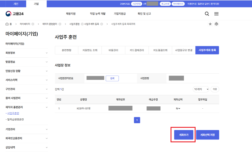 사업주 훈련>사업주 계좌등록(하단 캡쳐 화면) 참고하여 계좌 등록 진행 하시면 됩니다.